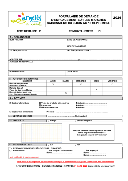FORMULAIRE DE DEMANDE D’EMPLACEMENT SUR LES MARCHÉS SAISONNIERS DU 9 JUIN AU 18 SEPTEMBRE