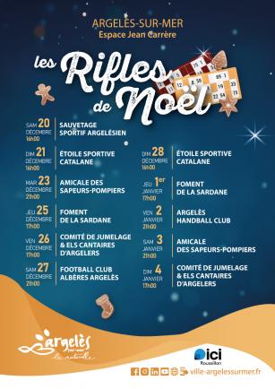 Les rifles de Noël sont de retour à l'espace Jean Carrère, du 20 décembre 2025 au 04 janvier 2026 ! Neuf associations argelésiennes vous offrent douze occasions de faire le plein de bonne humeur et de remporter de sympathiques lots.
