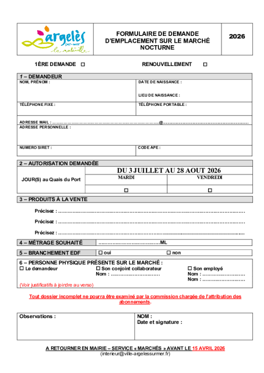 Formulaire de demande d'emplacement sur le marché nocturne 2026