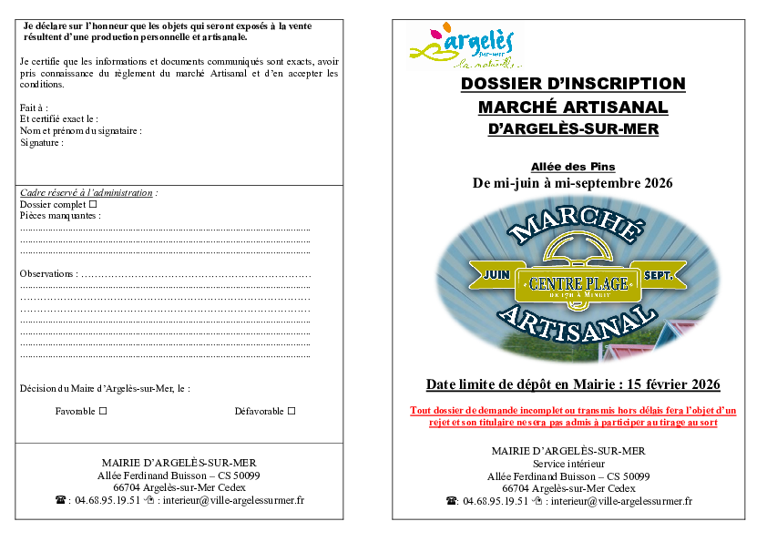 Demande d'emplacement sur le marché artisanal, ouvert de mi-juin à mi-septembre 2026, allée des Pins. À retourner complet en Mairie avant le 15 février 2026.