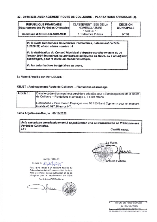 Décision municipale - 20/10/2025 pdf-310.79 Ko ajouté le 20-10-2025 Décision municipale du 20 octobre 2025 - Aménagement route de Collioure - Plantations arrosage Télécharger