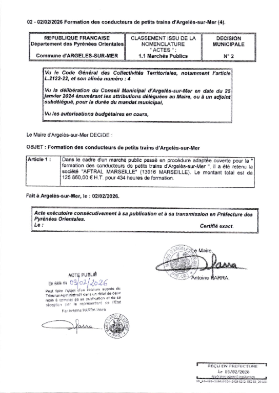Décision municipale - 09/02/2026 pdf-335.84 Ko ajouté le 09-02-2026 Décision municipale du 09 février 2026 - Formation des conducteurs de petits trains d'Argelès-sur-Mer Télécharger