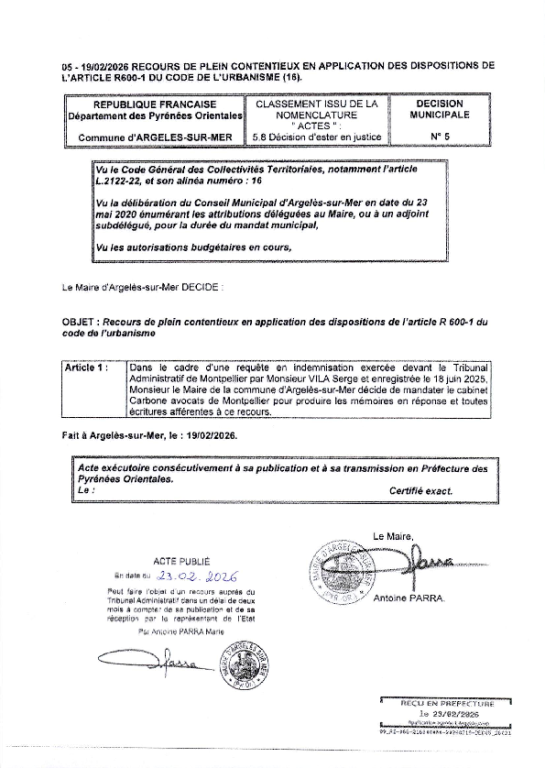 Décision municipale - 23/02/2026 pdf-344.62 Ko ajouté le 23-02-2026 Décision municipale du 23 février 2026 - Recours de plein contentieux en application des dispositions de l'article R600-1 du code de l'urbanisme (16). Télécharger