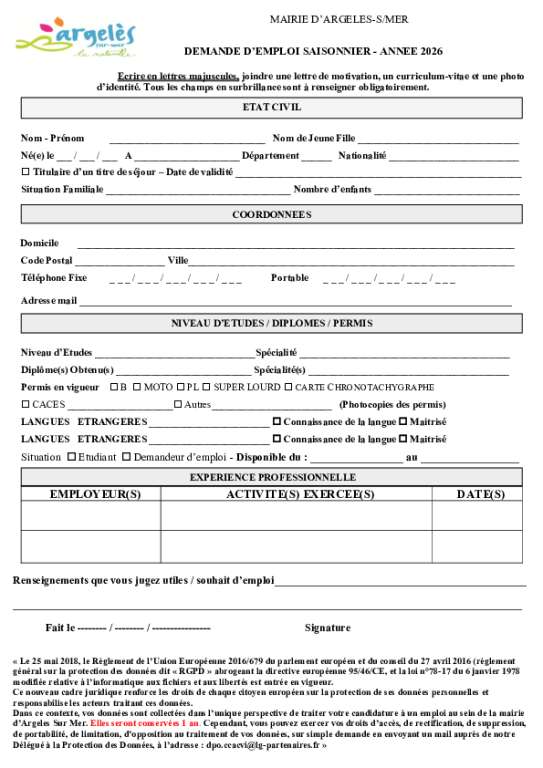 Demande d'emploi saisonnier 2026